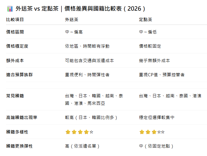 如果你對預算較為敏感,定點茶通常較容易控制花費;若重視方便性,外送茶則仍然是多數人的選擇。