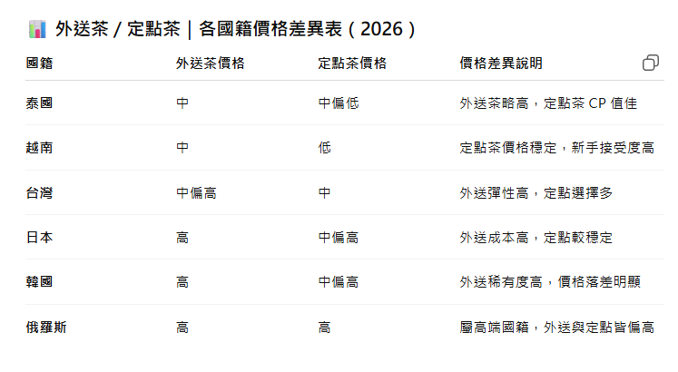 在 2026 年的實際市場中,外送茶的價格通常略高於定點茶,原因在於派遣成本與時間彈性。