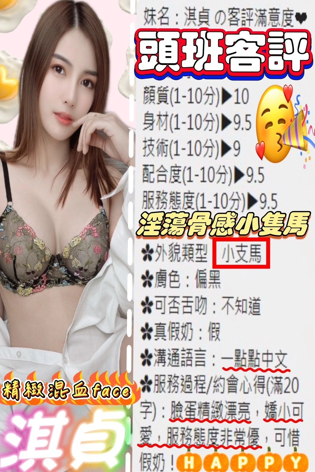 可配合 :奶砲,按摩,共浴,泰國浴,LG(舌吻)依氣氛衛生而定,可親嘴,無套吹,口爆,品鮑,舔蛋,奶推,屁推,冰火,顏射,絲襪(自備免付),玩具(按摩棒),玩具(跳蛋),情趣用品(客自備),快餐,2S