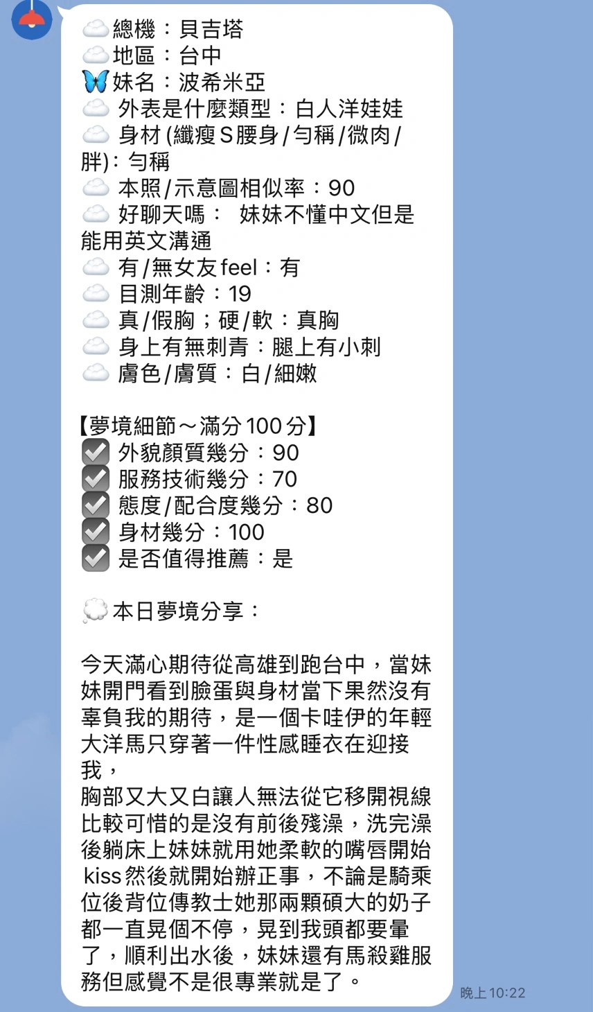 加價項目 : 2S+2000(60分),顏射+2000,口爆+2000,吞精+2000,清槍+1000,裸舌毒龍+2000,深喉嚨+2000,自慰秀+1000,艷舞秀+1000,足交+2000,戴套後門+3000,情趣用品+1000(客自備),攝影+3000(不露臉),雙飛搭配🇷🇺卡特琳娜+2000,外約禁止打槍(至少一節):不跑住家限旅館飯店,車資依地區計價