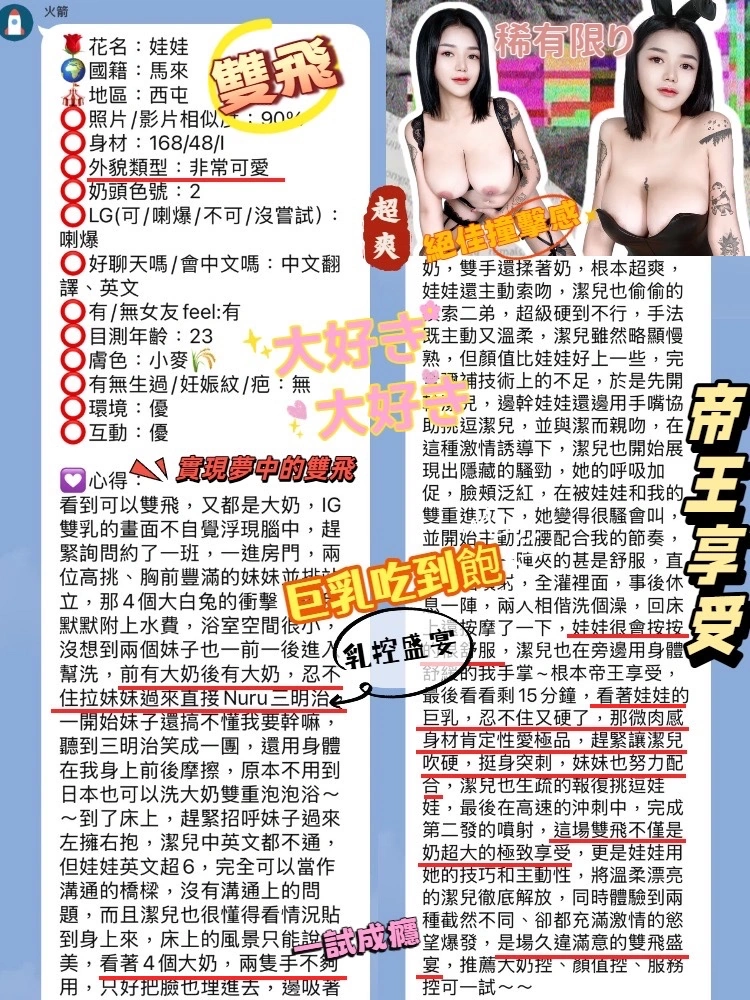 可配合 :奶砲,毒龍,按摩,69,共浴,LG(舌吻)依氣氛衛生而定,可親嘴,無套吹,口爆,品鮑,舔蛋,奶推,屁推,顏射,浴中蕭,艷舞秀,絲襪,玩具(按摩棒),玩具(跳蛋),情趣用品(客自備),無套做,無套內射,自慰秀,英文溝通,快餐,2S,包夜