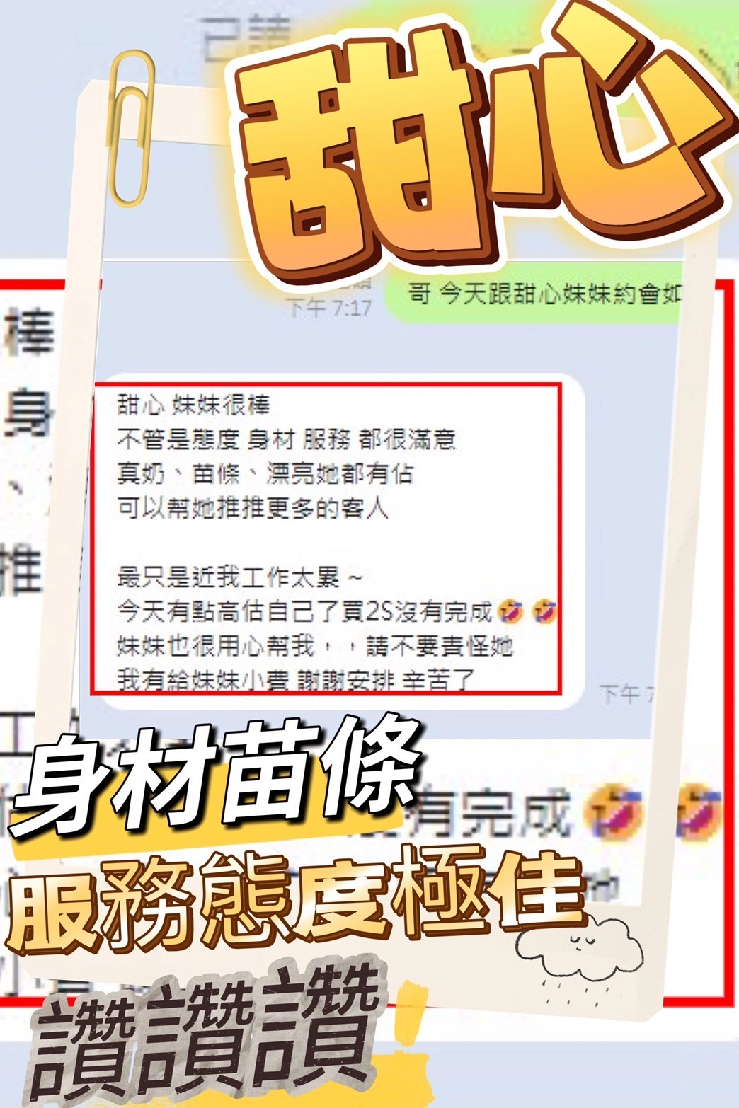 4️⃣見面後確認妹妹滿意後 將現金交給妹妹,即可開始享受服務。