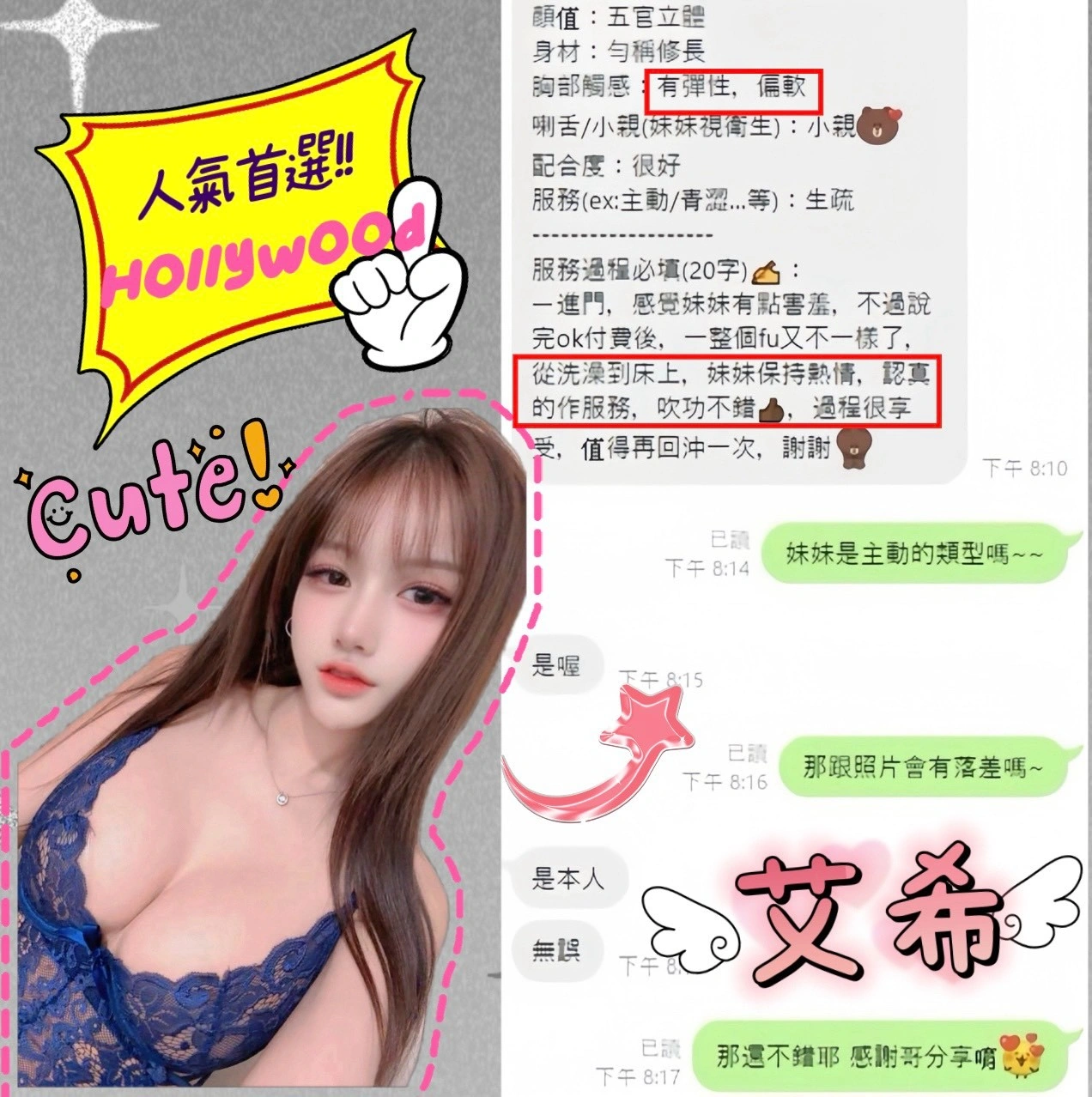 可配合 :奶砲,毒龍,按摩,69,共浴,LG(舌吻)依氣氛衛生而定,可親嘴,無套吹,口爆,吞精,品鮑,舔蛋,奶推,屁推,顏射,絲襪(自備免付),情趣用品(客自備),無套內射,英文溝通,快餐,2S,包夜