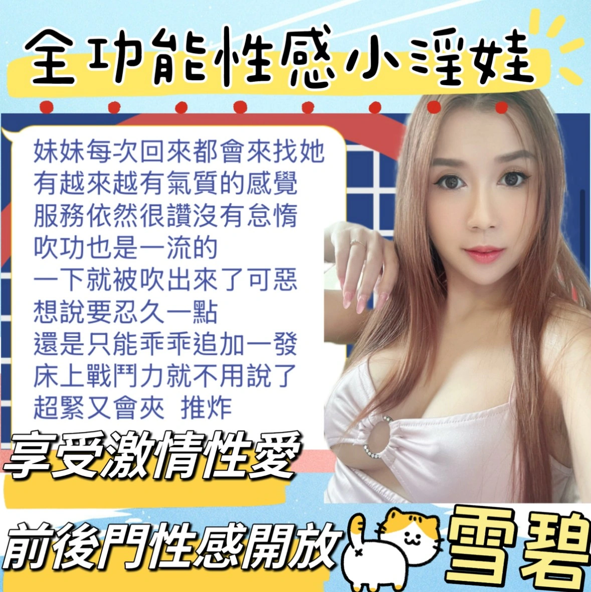 可配合 :奶砲,毒龍,按摩,69,共浴,LG(舌吻)依氣氛衛生而定,可親嘴,無套吹,口爆,吞精,潮吹(依貴賓技術而定),品鮑,奶推,顏射,變裝,變裝(自備免付),絲襪,絲襪(自備免付),玩具(按摩棒),玩具(跳蛋),情趣用品(客自備),無套做,無套內射,自慰秀,英文溝通,快餐
