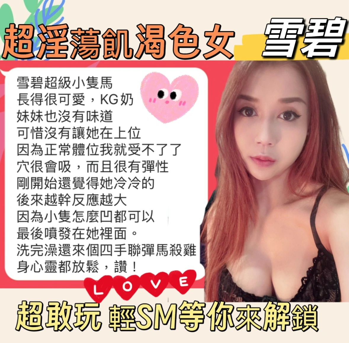 加價項目 : 2S+500,口爆+500,口爆吞精1000,顏射+500,無套內射+1000,自衛秀+500,情趣用品+500,清槍+500