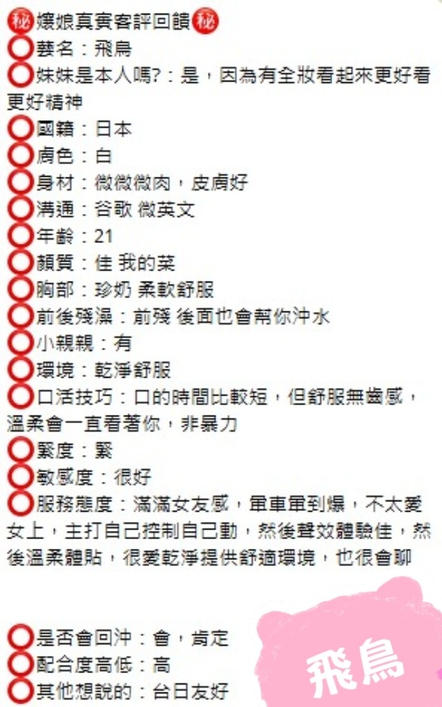 可配合 :奶砲,按摩,69,陪洗,共浴,殘廢澡,LG(舌吻)依氣氛衛生而定,可親嘴,無套吹,品鮑,舔蛋,漫遊,奶推,屁推,變裝(自備免付),絲襪(自備免付),玩具(按摩棒),玩具(跳蛋),情趣用品(客自備),無套做,無套內射,自慰秀,攝影,NS,包夜