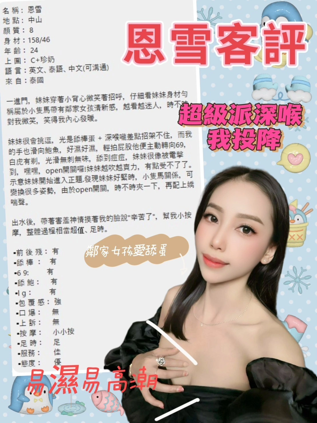 可配合 :奶砲,毒龍,按摩,69,殘廢澡,LG(舌吻)依氣氛衛生而定,可親嘴,無套吹,口爆,吞精,品鮑,舔蛋,過水,漫遊,奶推,屁推,冰火,浴中蕭,深喉嚨,艷舞秀,絲襪(自備免付),玩具(按摩棒),玩具(跳蛋),情趣用品(客自備),無套做,無套內射,後門,自慰秀,中文溝通,英文溝通,快餐,2S,包夜
