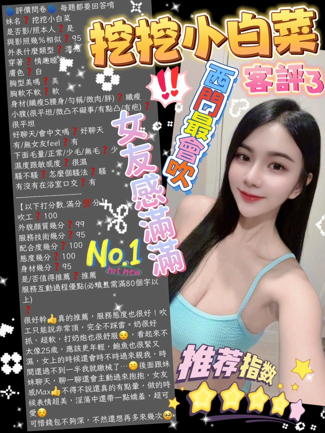 可配合 :奶砲,按摩,69,殘廢澡,LG(舌吻)依氣氛衛生而定,可親嘴,無套吹,口爆,品鮑,舔蛋,奶推,顏射,浴中蕭,深喉嚨,艷舞秀,跳跳糖吹簫,變裝(自備免付),絲襪,玩具(按摩棒),玩具(跳蛋),情趣用品(客自備),自慰秀,攝影,白人,快餐,2S,包夜,射後清槍