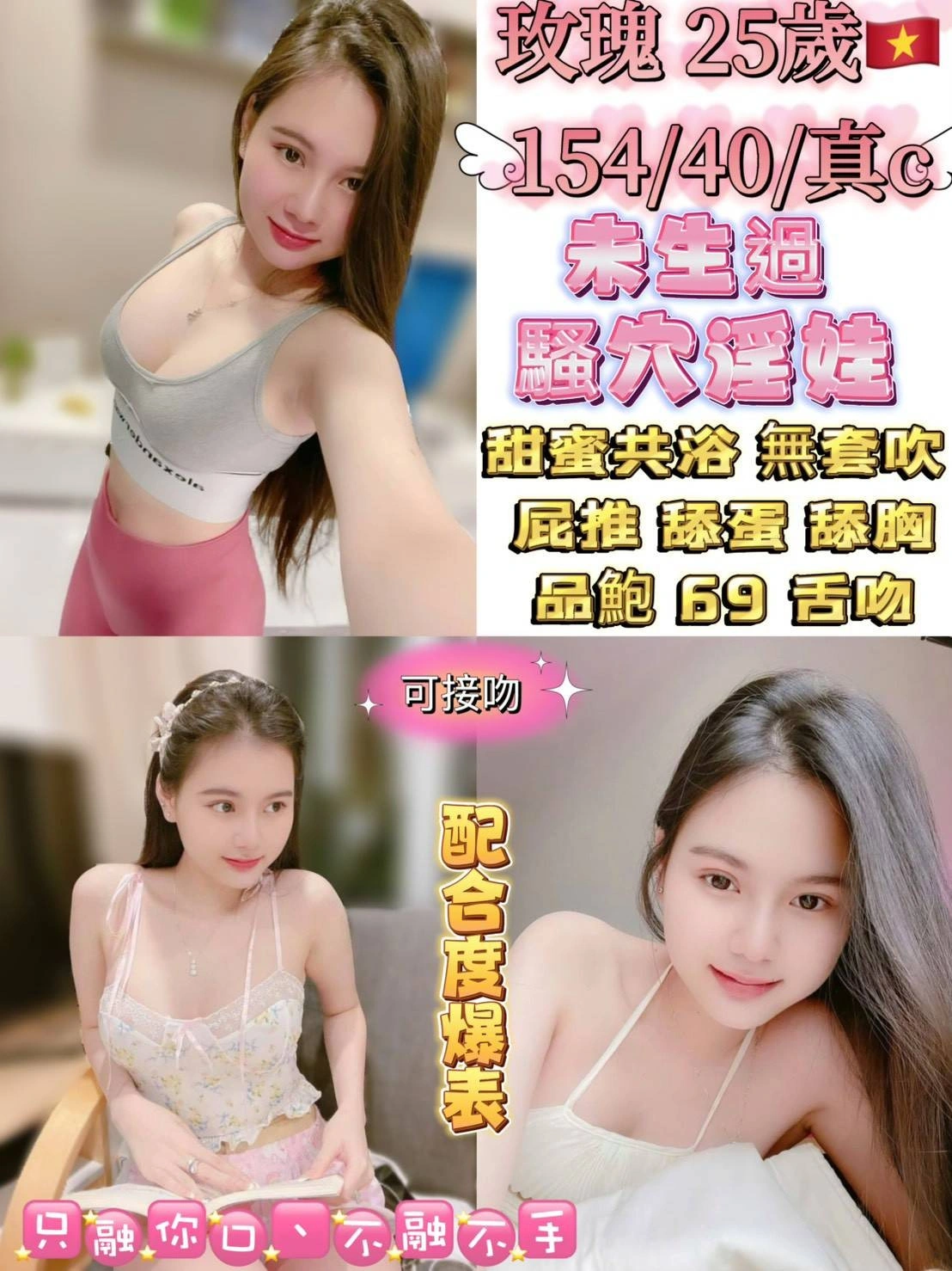 可配合 :奶砲,按摩,69,共浴,LG(舌吻)依氣氛衛生而定,可親嘴,無套吹,口爆,品鮑,舔蛋,屁推,快餐,2S