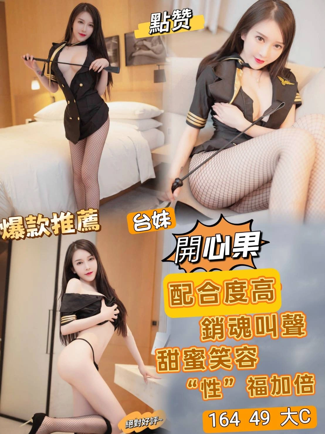 可配合 :奶砲,按摩,69,泡泡浴,LG(舌吻)依氣氛衛生而定,可親嘴,無套吹,品鮑,舔蛋,奶推,屁推,變裝,絲襪,玩具(按摩棒),玩具(跳蛋),自慰秀,攝影,快餐,2S