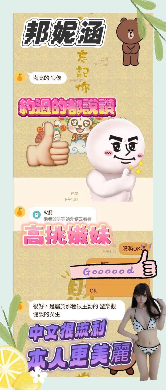 可配合 :奶砲,按摩,69,陪洗,共浴,LG(舌吻)依氣氛衛生而定,可親嘴,無套吹,口爆,品鮑,舔蛋,自慰秀,快餐,2S,包夜,射後清槍