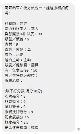 可配合 :奶砲,按摩,69,殘廢澡,LG(舌吻)依氣氛衛生而定,可親嘴,無套吹,口爆,品鮑,舔蛋,奶推,屁推,變裝(自備免付),無套做,無套內射,自慰秀,攝影,快餐,2S,包夜