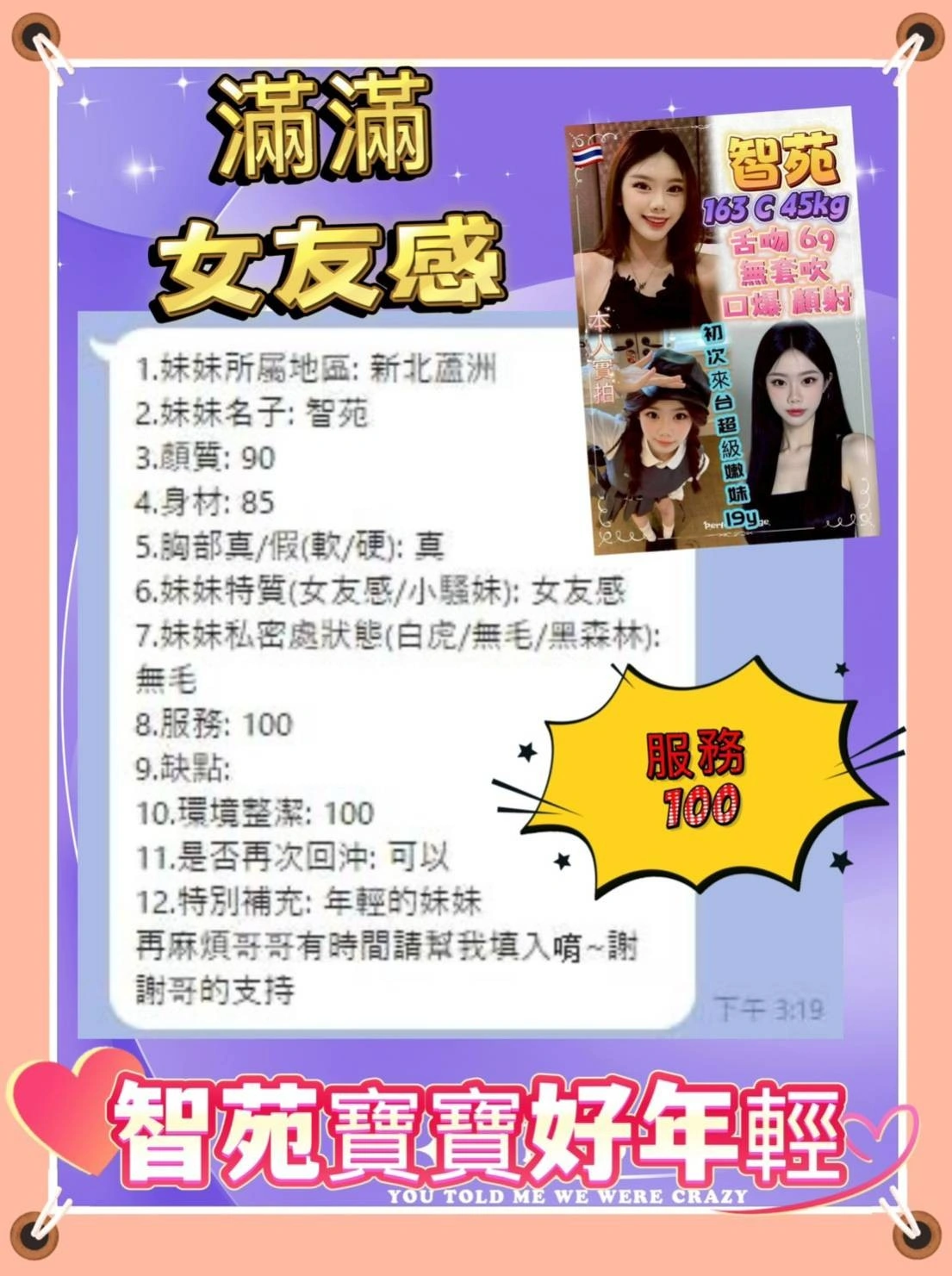可配合 :奶砲,按摩,69,共浴,殘廢澡,LG(舌吻)依氣氛衛生而定,可親嘴,無套吹,口爆,足交,品鮑,舔蛋,顏射,深喉嚨,艷舞秀,絲襪(自備免付),自慰秀,快餐,2S,包夜