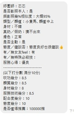 可配合 :奶砲,按摩,69,殘廢澡,LG(舌吻)依氣氛衛生而定,可親嘴,無套吹,品鮑,奶推,屁推,浴中蕭,艷舞秀,變裝(自備免付),絲襪(自備免付),自慰秀,中文溝通,快餐,2S