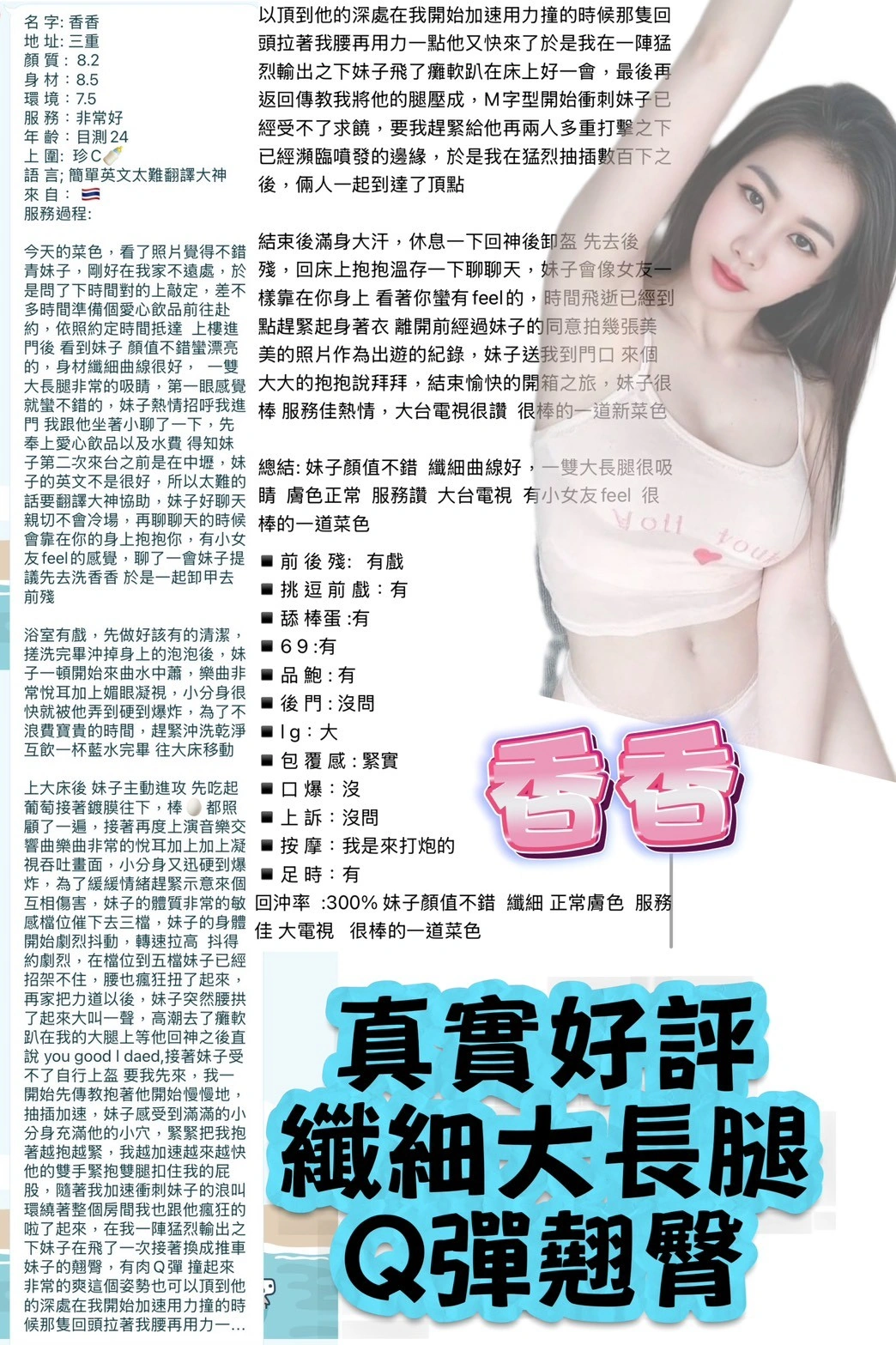 可配合 :按摩,69,共浴,LG(舌吻)依氣氛衛生而定,可親嘴,無套吹,口爆,品鮑,顏射,絲襪(自備免付),快餐,2S,NS