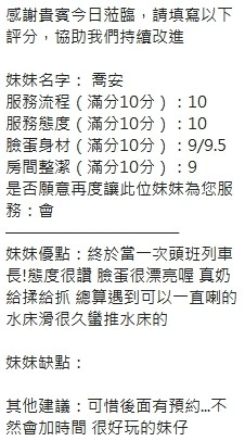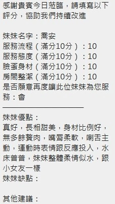 可配合 :奶砲,按摩,69,共浴,泰國浴,LG(舌吻)依氣氛衛生而定,可親嘴,無套吹,口爆,品鮑,舔蛋,奶推,屁推,顏射,水床浴,變裝(自備免付),絲襪(自備免付),快餐,2S