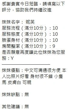 可配合 :奶砲,按摩,69,共浴,LG(舌吻)依氣氛衛生而定,可親嘴,無套吹,口爆,品鮑,舔蛋,奶推,屁推,顏射,水床浴,變裝(自備免付),絲襪(自備免付),中文溝通,快餐,2S,包夜