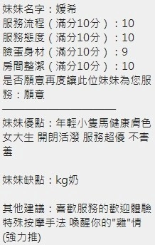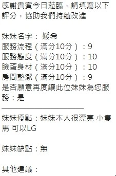 可配合 :奶砲,按摩,69,共浴,LG(舌吻)依氣氛衛生而定,可親嘴,無套吹,品鮑,舔蛋,奶推,屁推,水床浴,變裝(自備免付),絲襪(自備免付),快餐,2S
