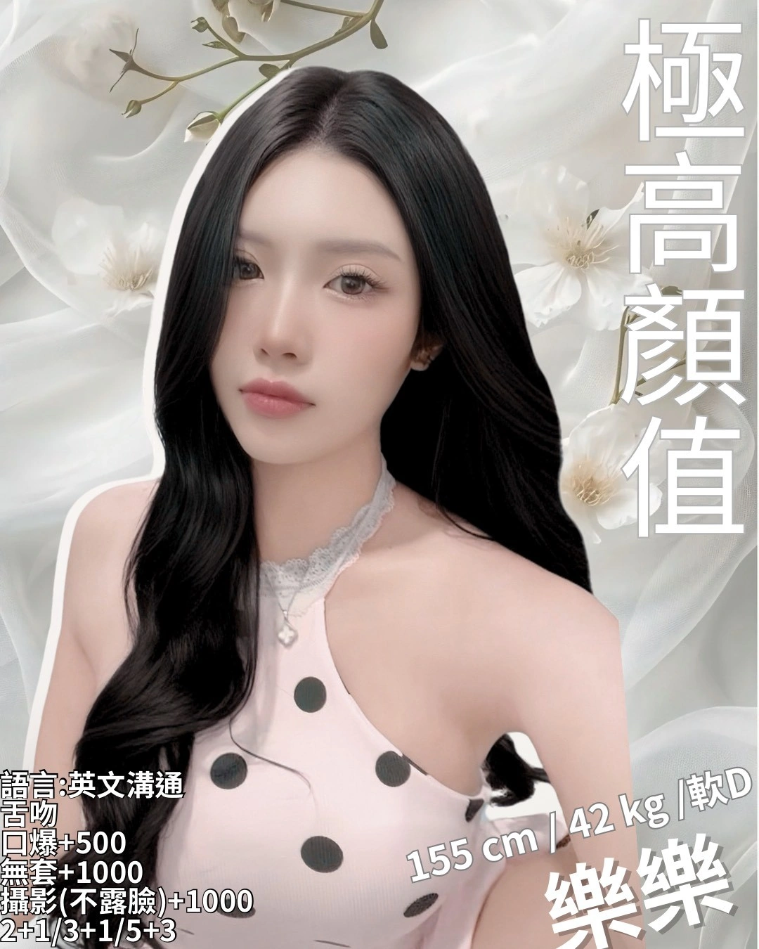 可配合 :奶砲,按摩,69,共浴,LG(舌吻)依氣氛衛生而定,可親嘴,無套吹,口爆,品鮑,舔蛋,奶推,屁推,冰火,浴中蕭,變裝(自備免付),絲襪(自備免付),攝影,快餐,2S,NS,包夜