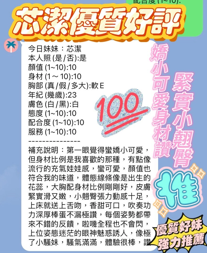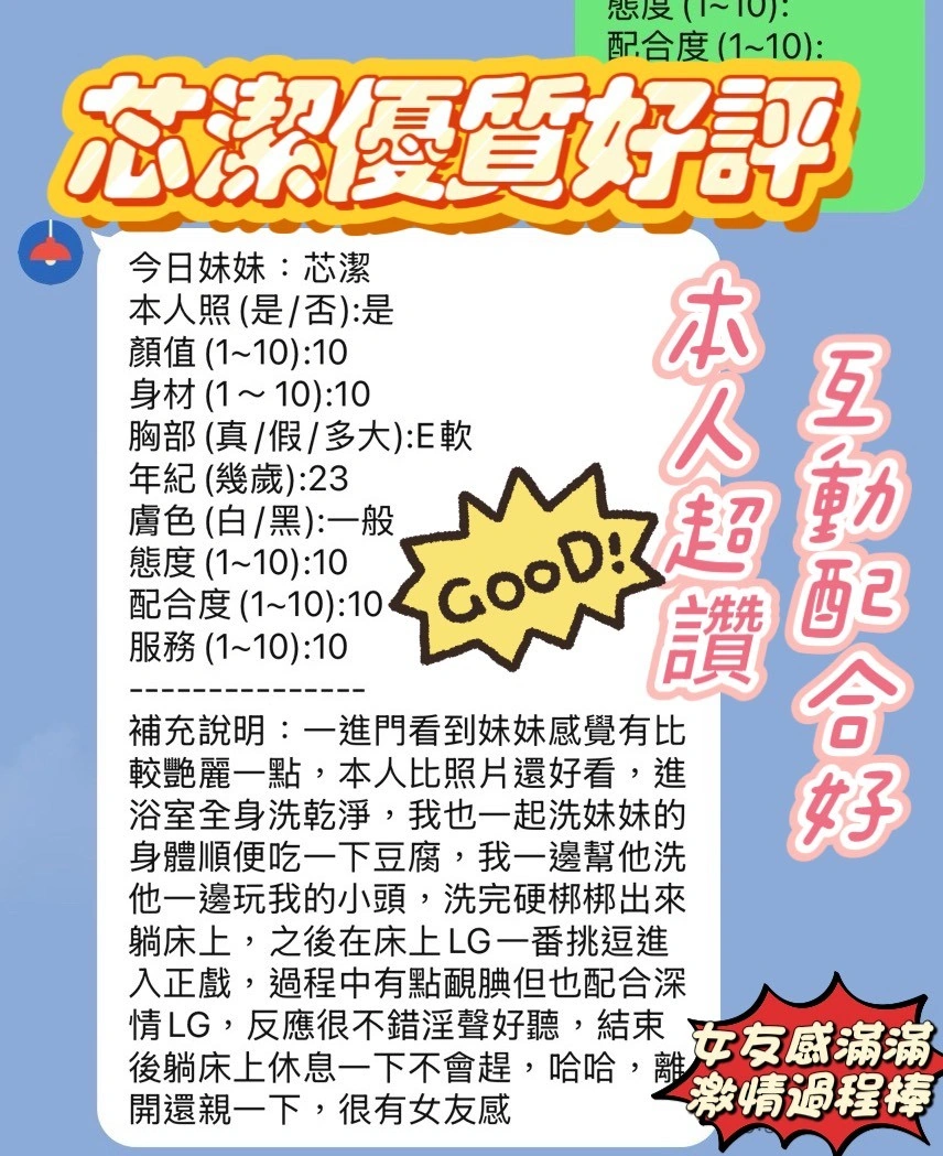 可配合 :奶砲,按摩,69,共浴,泰國浴,LG(舌吻)依氣氛衛生而定,可親嘴,無套吹,口爆,足交,品鮑,舔蛋,奶推,屁推,顏射,浴中蕭,深喉嚨,變裝(自備免付),絲襪(自備免付),快餐,2S
