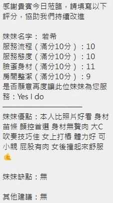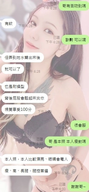 可配合 :按摩,69,共浴,LG(舌吻)依氣氛衛生而定,可親嘴,無套吹,品鮑,舔蛋,奶推,屁推,變裝(自備免付),絲襪(自備免付),無套做,無套內射,快餐,2S
