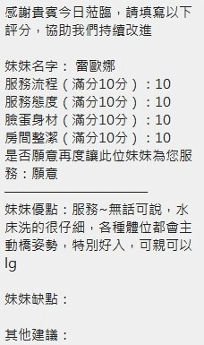 可配合 :奶砲,毒龍,按摩,69,共浴,LG(舌吻)依氣氛衛生而定,可親嘴,無套吹,口爆,品鮑,舔蛋,奶推,屁推,顏射,水床浴,變裝(自備免付),絲襪(自備免付),無套做,無套內射,後門,快餐,2S