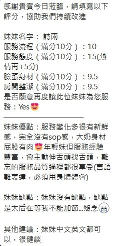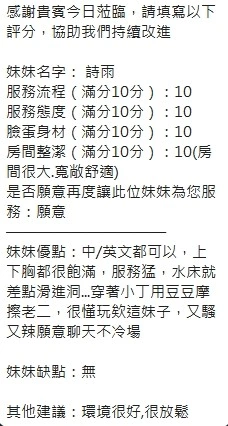 可配合 :奶砲,毒龍,按摩,69,共浴,LG(舌吻)依氣氛衛生而定,可親嘴,無套吹,口爆,品鮑,舔蛋,奶推,屁推,顏射,水床浴,變裝(自備免付),絲襪(自備免付),無套做,無套內射,中文溝通,快餐,2S,包夜