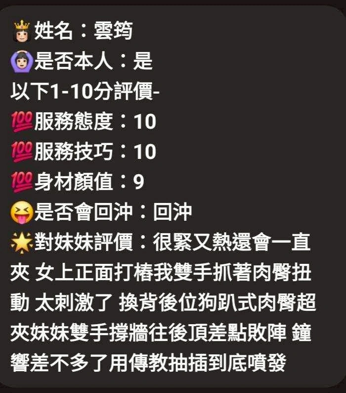 可配合 :奶砲,毒龍,按摩,69,共浴,殘廢澡,泰國浴,LG(舌吻)依氣氛衛生而定,可親嘴,無套吹,口爆,吞精,品鮑,舔蛋,奶推,屁推,顏射,絲襪(自備免付),自慰秀,快餐,2S,NS