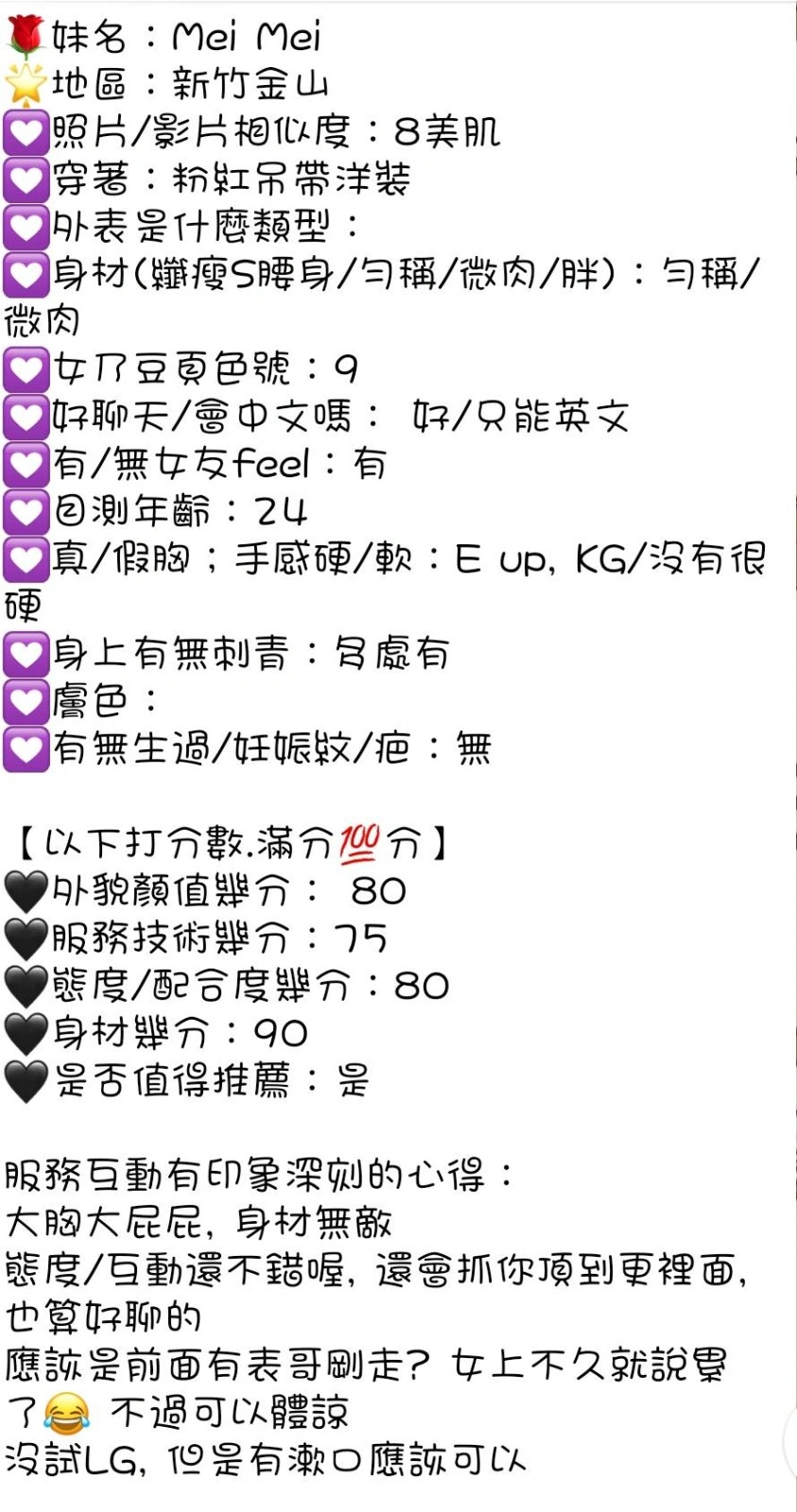 可配合 :奶砲,按摩,69,共浴,LG(舌吻)依氣氛衛生而定,可親嘴,無套吹,口爆,品鮑,舔蛋,奶推,屁推,冰火,顏射,絲襪,自慰秀,攝影,快餐,2S,NS