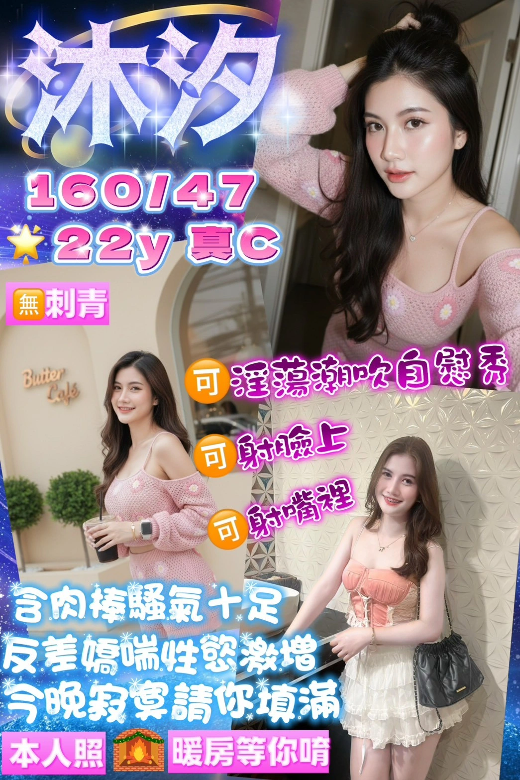 可配合 :奶砲,按摩,69,殘廢澡,LG(舌吻)依氣氛衛生而定,可親嘴,無套吹,口爆,品鮑,舔蛋,奶推,屁推,冰火,顏射,浴中蕭,變裝(自備免付),絲襪(自備免付),玩具(按摩棒),玩具(跳蛋),情趣用品(客自備),自慰秀,英文溝通,快餐,2S