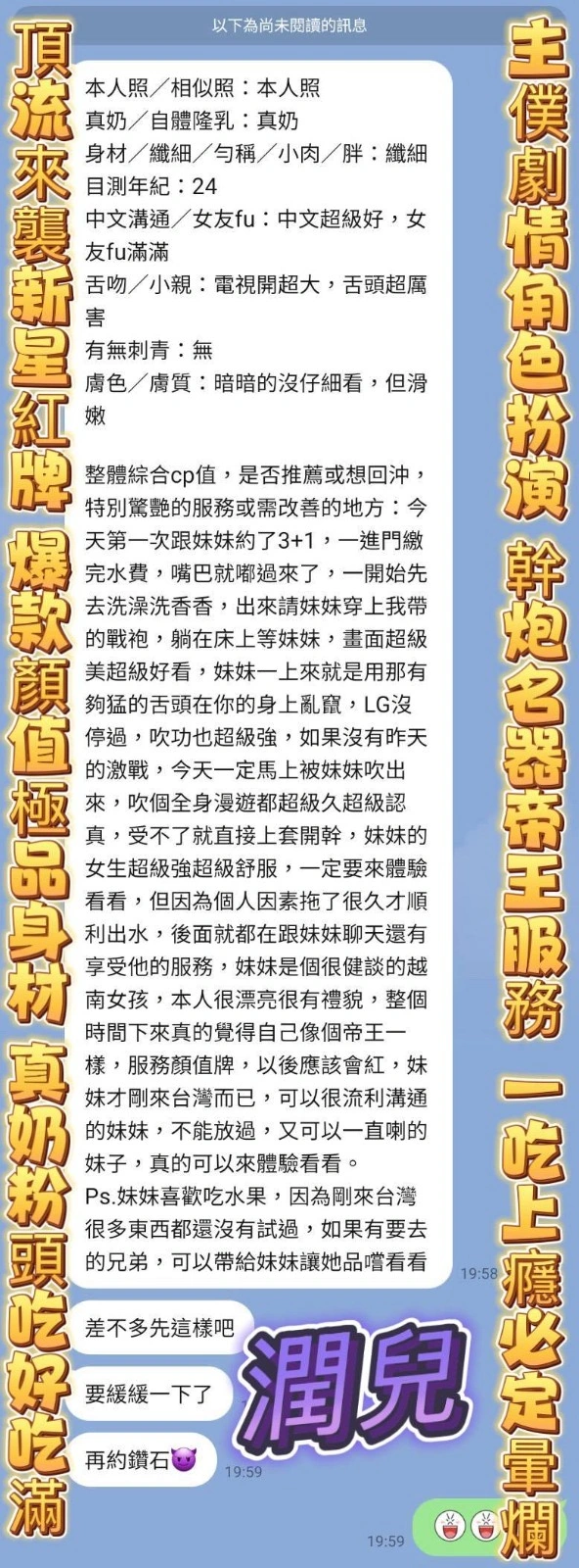不接受 : 酒客,毒品,陌生客,皮膚異常者,性癖好特殊者