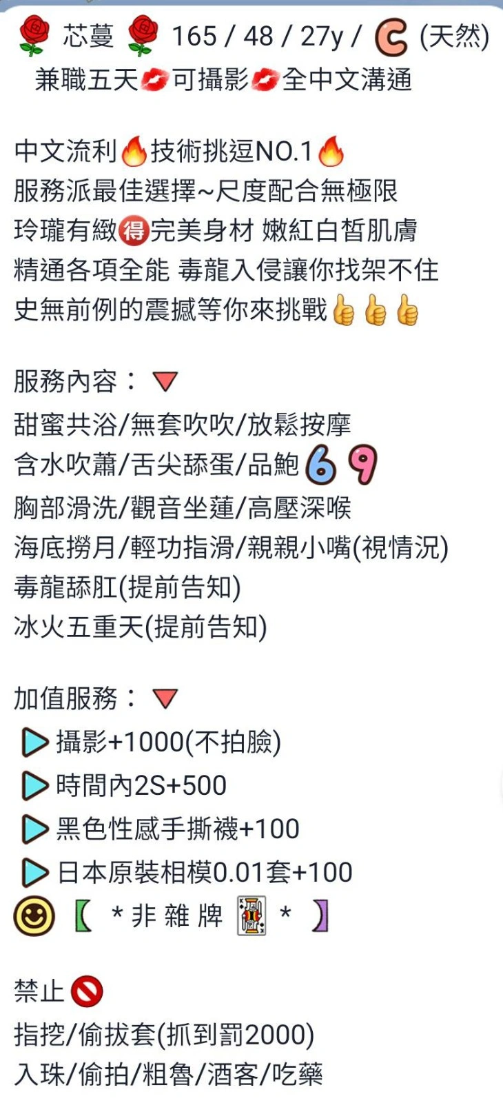 答:不可以哦,因為妹妹都是兼職的,在我們這般約她我們能保證在第一時間保護雙方的安全。如果加聯絡方式自己約,出現任何經濟糾紛與我們無關(有真實案例),請重視!!!